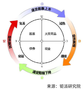 上图为美林时钟,也称投资时钟,是很多投资机构都会谈到的理论框架。它以经济增长、通胀两个维度画出四个象限,并以此为基础去判断在经济运行的不同状态下应该投资的标的品类——股票、大宗商品、债券、现金等。