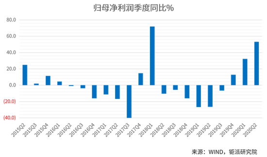 上图罗列了创业板50(新兴行业龙头公司)及创业板综的归母净利润季度同比,2020Q2达到2018Q2以来新高,超过以往90%以上的时间,这其中的市场涨跌幅趋势也是类似的。