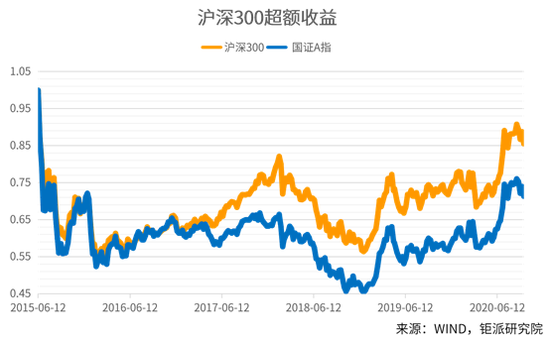 2015年6月12月创业板指数达高位后至往后5年,沪深300的涨跌幅超过国证A指(此处以国证A指为市场平均水平的参考)。之所以关注沪深300的超额收益,是因为沪深300里代表了A股市场4000支公司中市值最高的300家。上图从市场表现的结果上来看,传统理念中认为小公司更有未来、更有成长性的看法并不一定正确,相较起来,资本市场反而持续认可大公司。