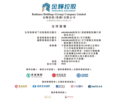 10月16日,行业排名TOP40的金辉控股(集团)有限公司(以下简称“金辉控股”)通过港交所上市聆讯,这意味着金辉控股登陆资本市场又迈出了关键一步,港交所也将迎来一家规模准千亿的房地产商。据了解,金辉控股将于10月16日至21日进行国际配售和香港公开发售,配售比分别为90%和10%。目前IPO定价区间已敲定,并于10月21日确定最终发行价,每股定价为3.5港元—4.5港元,最高募资31.05亿港元。