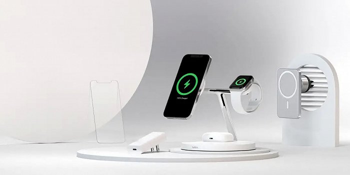 首先是和苹果关系较近的贝尔金,它新推出的三合一充电座,以及车载充电头,均是利用 MagSafe 来为 iPhone 充电。