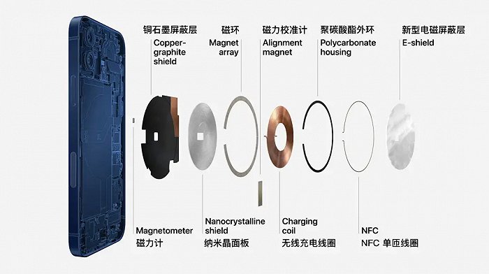 从官方分解图中能看到,这套 MagSafe 组件由很多不同的元件组成,包含了磁力计、屏蔽层、磁环和 NFC 线圈等。