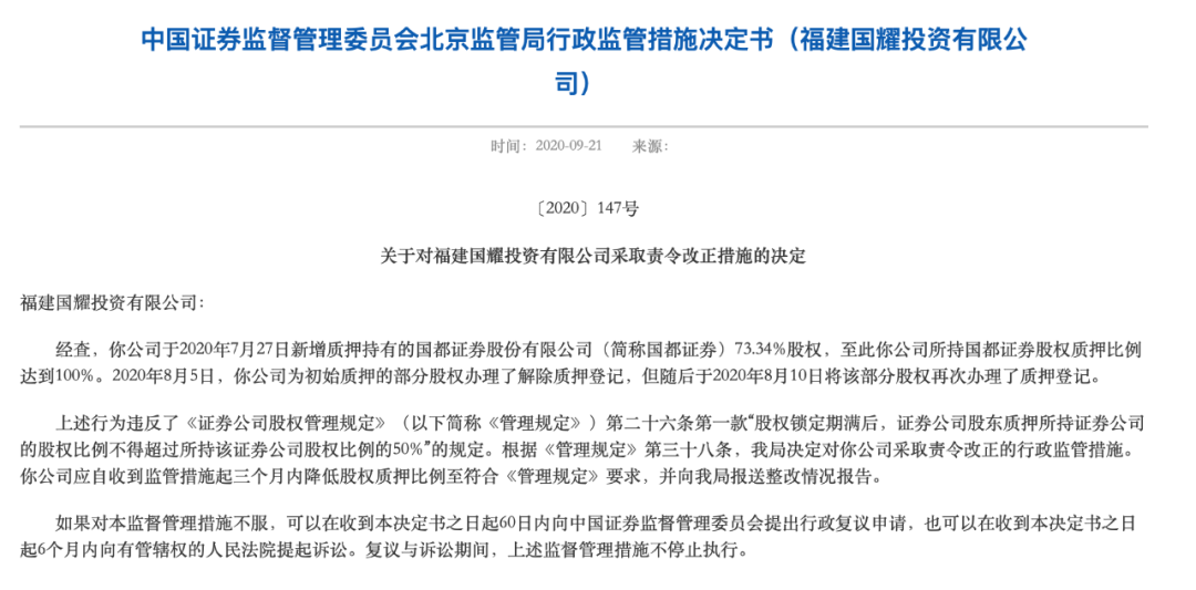 在9月,北京证监局对国都证券的股东采取责令改正措施的决定。监管层发现福建国耀投资有限公司于7月27日新增质押持有的国都证券73.34%股权,至此质押比例达到100%。8月5日该公司为初始质押的部分股权办理了解除质押登记,但随后于8月10日将该部分股权再次办理了质押登记。