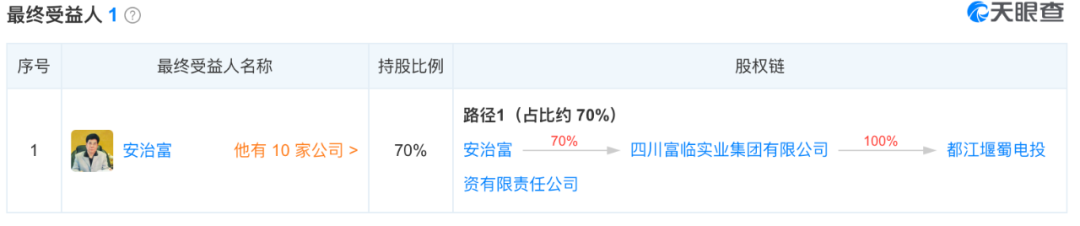 天眼查专业版APP显示,都江堰蜀电投资的实际控制人是安治富。