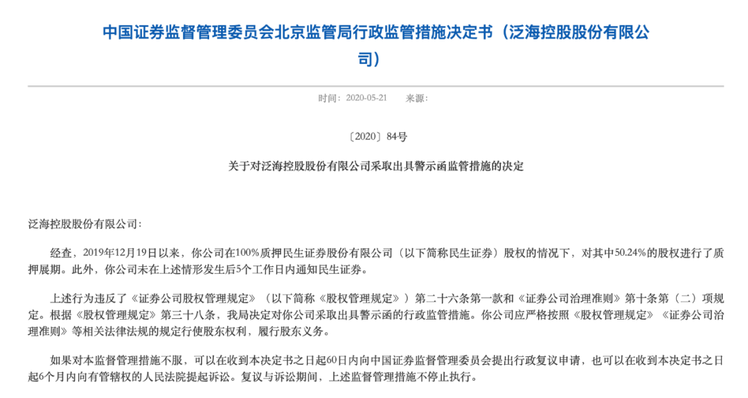 今年5月,北京证监局对民生证券的大股东泛海控股股份有限公司出具警示函,称2019年12月19日以来,泛海控股在100%质押民生证券股份股权的情况下,对其中50.24%的股权进行了质押展期,并且未在上述情形发生后5个工作日内通知民生证券。