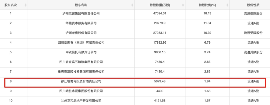 据了解,都江堰蜀电投资是华西证券的第8大股东,持股比例1.94%。招股书显示,都江堰蜀电投资更名前为成都电业局都江堰电力公司,自2000年华西证券成立时就已经在了。