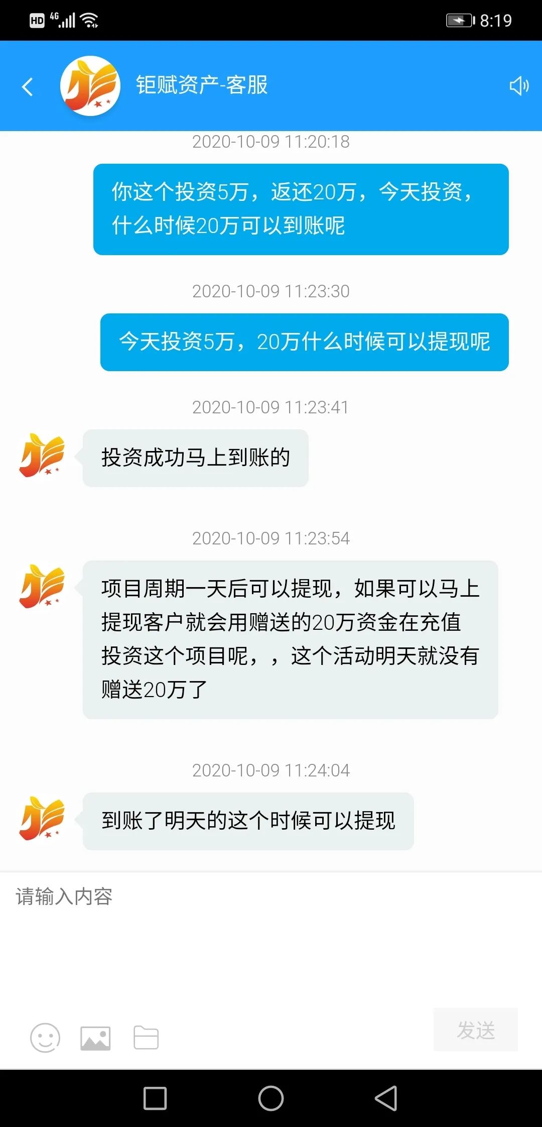 当你尝到甜头之后,骗子会并声称自己已经掌握了这个股票APP的规律,只要跟着他(她)投资稳赚不赔。这时,你已经深信不疑,便往平台里面大量投入。