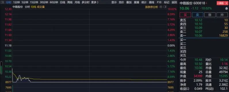 9月28日,中路股份低开并迅速跌停,随后打开跌停板,不过在小幅反弹后,又再次跌停,全天收报10.06元/股,仍有1.68万手封单牢牢封死在跌停板上。