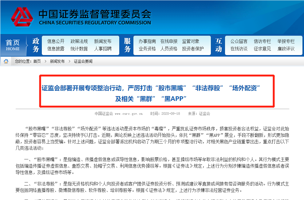 在9月18日证监会新闻发布会上,证监会表示已部署开展专项整治行动,严厉打击“股市黑嘴”“非法荐股”“场外配资”及相关“黑群”“黑APP”。