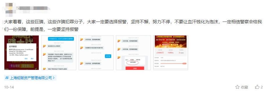 根据陈某夫妇陈述,他们于2020年7月下旬无意看到一个投资理财的视频,因为视频中所描述的收益十分诱人,夫妻俩便扫描视频中的二维码下载安装了一个名为“钜赋资产”的APP,并用身份证信息进行了实名注册。为了检验视频内容真假,陈某试着向APP内充值2000元进行投资,发现收益果然不错,并且钱可以提现出来。尝到甜头的陈某与妻子逐步加大投资金额,先后投资120余万元,期间他们提现过2万元收益,没有发现任何异常,在不到三个月时间自己的账户里就有190余万元分红。