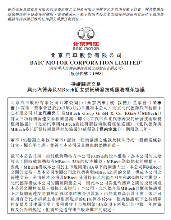 至此,戴姆勒与MBtech已不再有关系。只是,令人费解的是,就在戴姆勒宣布出售完MBtech剩余股份前一年,北京汽车、北汽德奔和MBtech于2017年3月签订了三项为期三年的持续关联交易框架协议,三份协议内容都是与委托研发技术服务有关,三份协议的委托方与受托方分别是北京汽车与北汽德奔、北京汽车与MBtech、北汽德奔与MBtech。