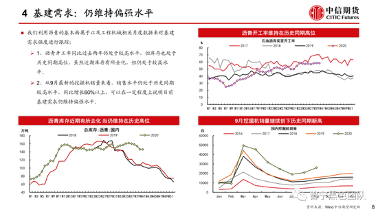 基建需求仍偏强:沥青开工率同比过去两年仍处于较高水平,但库存也处于历史同期高位;从9月最新的挖掘机销量来看,销售水平仍处于历史同期较高水平,同比增长60%以上,可以在一定程度上说明目前基建需求仍维持偏强水平。