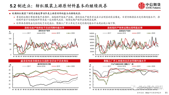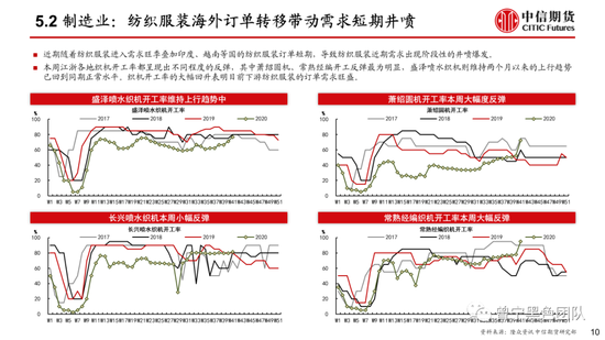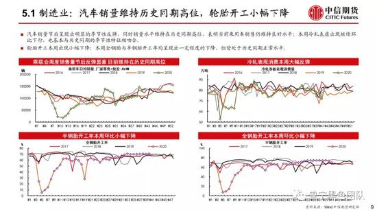 制造业:汽车销量维持历史同期高位,轮胎开工率维持历史同期正常水平;纺织服装需求短期呈现出井喷的特征,织造开工率呈现出明显回升,带动上游原材料基本面继续改善。