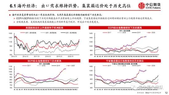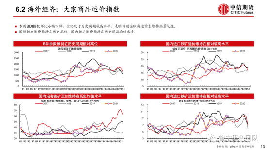出口及海运费:集装箱运价指数继续创下历史新高,国内出口需求维持改善趋势;国际海运费景气度维持高位,铁矿石运费仍维持较高水平。