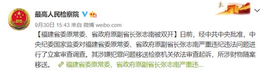 最高人民检察院依法对福建省原副省长张志南决定逮捕