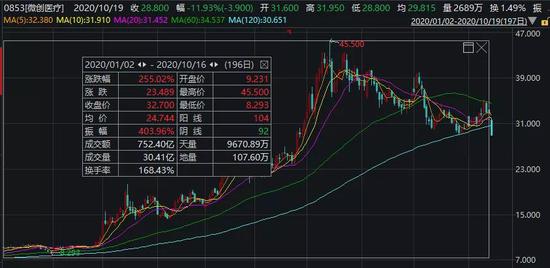此后,微创医疗的股价犹如坐上了火箭,截至上一个交易日,股价从年初至今上涨了255%,年内最高涨幅达到404%。
