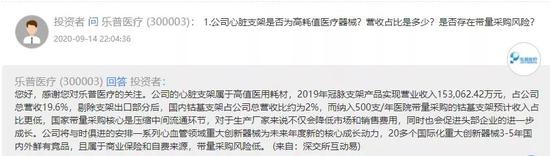 乐普医疗在交易所互动平台回复投资者是否存在带量采购风险时称,公司2019年冠脉支架产品实现营业收入15.3亿元,占公司总营收19.6%,剔除支架出口部分后,国内钴基支架占公司总营收比约为2%,而纳入500支/年医院带量采购的钴基支架预计收入占比更低,国家带量采购核心是压缩中间流通环节,对于生产厂家来说不仅会降低销售费用,同时也会促进头部企业的进一步成长。