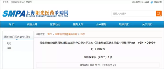 10月16日,国家组织高值医用耗材联合采购办公室发布《国家组织冠脉支架集中带量采购文件》,由天津市医药采购中心承担联合采购办公室日常工作,向相关企业发起谈判邀请。