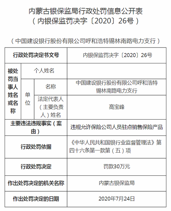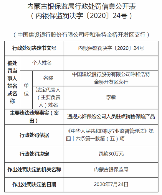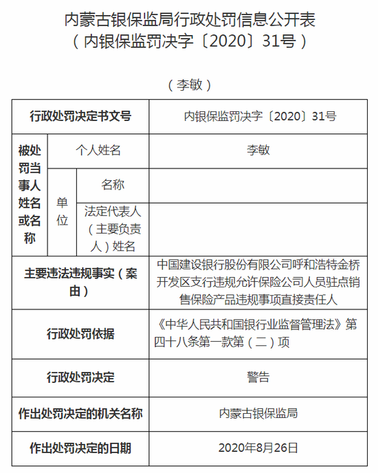 处罚信息显示,建行呼和浩特锡林南路电力支行、桥开发区支行违规允许保险公司人员驻点销售保险产品,高宝峰、李敏系违规事项直接责任人,内蒙古银保监局根据《中华人民共和国银行业监督管理法》第四十八条第一款第(二)项,对两人作出警告。此前,两人因为同样事由,已分别被处罚30万元。