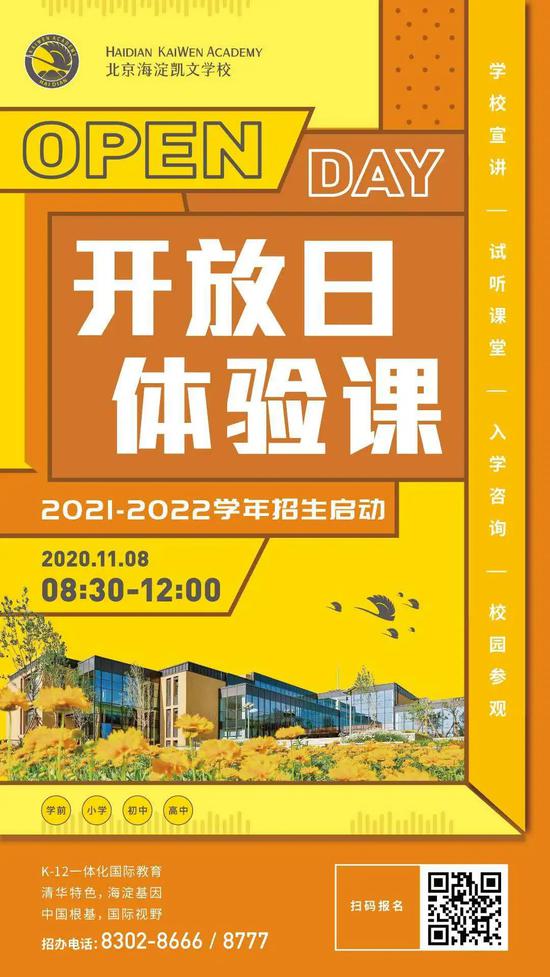北京海淀凯文学校2021-2022招生工作正式启动,扫码参加本学年第一次大型校园开放日。