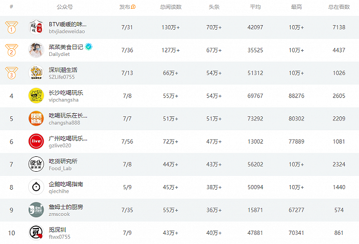在国内前50名美食类公众号中,有将近一半是本地美食探店类账号,头条阅读量几乎都超过5W。几乎每个地区,县级市都有这类账号。