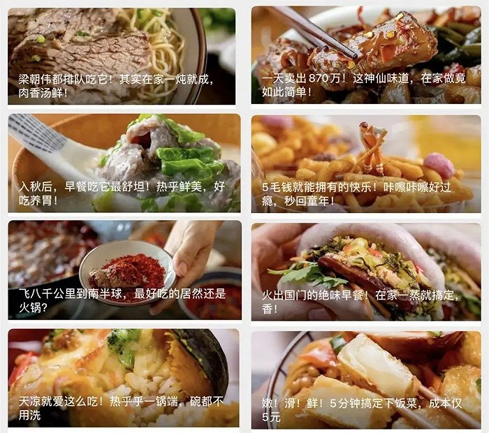另外, 因为素材成本相对较低的原因,这类账号不需要运营者自己制作美食,不需要摄影棚。只需要一两个人上门拍摄美食,就可以着手做内容。