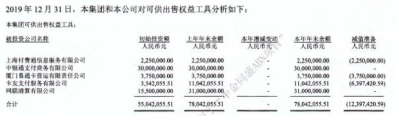 报告提到,银联商务持有海联金汇(002537)股份,海联金汇旗下有第三方支付联动优势。公开信息显示,截至上半年末,银联商务持有海联金汇7.11%股份。此外,19年统计显示,银联商务还投资了付费通、中银通支付、卡友支付、厦门易通卡、网联清算。工商信息显示,付费通目前由拼多多高管关联公司控股,银联商务持股比例2.22%。中银通支付于2011年申请预付卡业务许可,官网称获得人民银行特许经营批复,其曾因不在央行许可机构(支付机构)列表,使用银联标识、预存金额发“畅游江苏卡”引起争议。