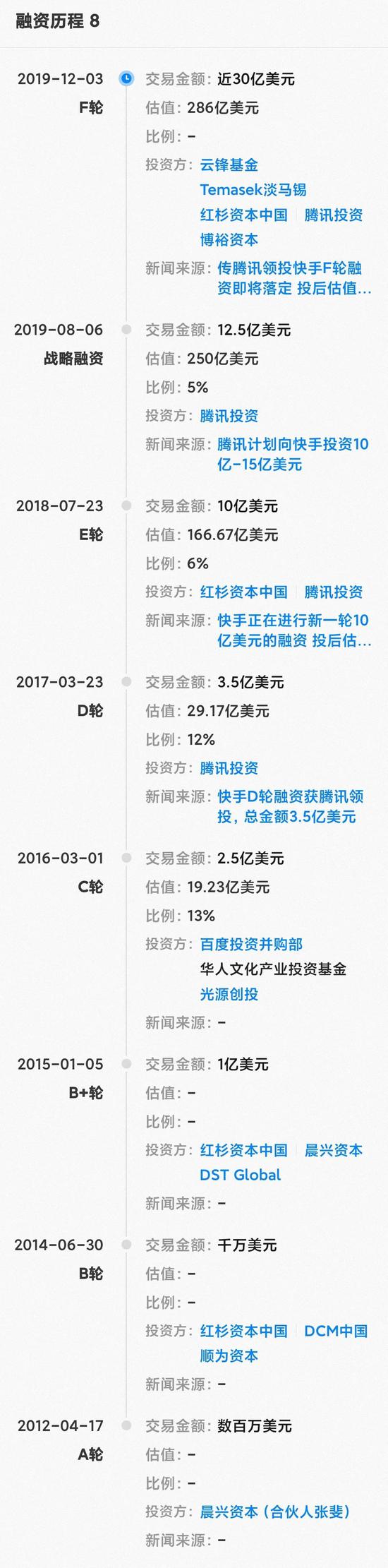 去年12月份,快手按照286亿美元的市值完成F轮融资,融资额近30亿美元,腾讯领投20亿美元,占快手总股份20%;今年9月,还传出快手启动了Pre-IPO轮融资,腾讯再次加持,加固大股东地位,据称此轮融资快手的估值在300亿美元以上。但是该消息随后没有下文,快手公关部也表示没有传播过这一轮融资。
