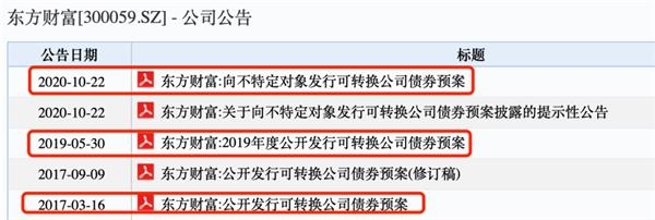 回溯东方财富上市以来的再融资历程,发现其对于可转债的偏爱一如既往——从2017年3月至今,不到4年的时间里,东方财富已发布了三份可转债发行预案。