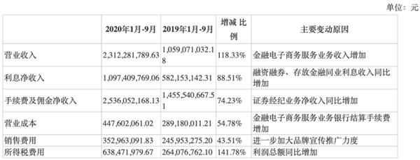 数据显示,今年前三季度,得益于融资融券、存放金融同业利息收入同比增加,东方财富共实现利息净收入10.97亿元,同比增加88.51%;因证券经纪业务净收入同比增加,实现手续费及佣金净收入25.36亿元,同比增加74.23%。