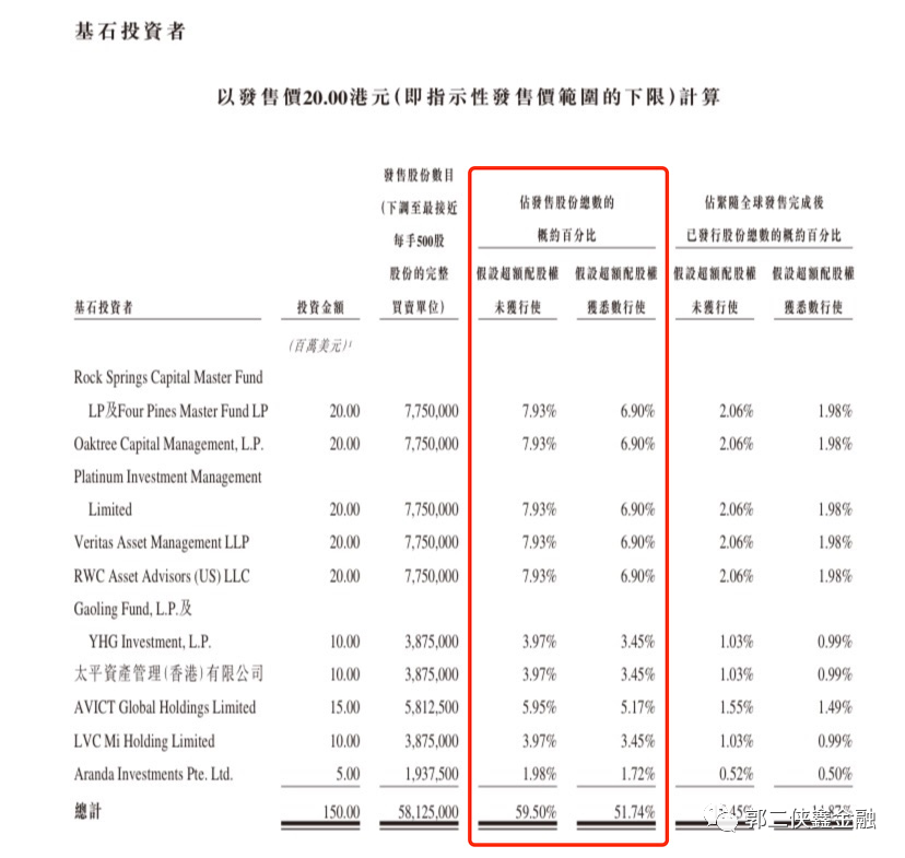 基石投资者阵容十分豪华,云集了国内国际知名机构,包括Rock Springs Capital、橡树资本管理公司(Oaktree Capital Management)、Platinum investment management limited、Veritas Asset Management、RWC Asset Advisors各认购2000万美元股份;高瓴资本、太平资产管理、LVC Mi Holdings Limited各认购1000万美元股份;AVICT Global Holdings Limited认购1500万美元股份;Aranda Investments认购500万美元股份。
