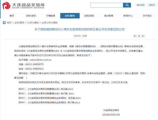 热点栏目为满足棕榈油期货引入境外交易者相关业务需要,根据《期货交易管理条例》、《期货交易所管理办法》等有关法规和规章,我所拟修改《大连商品交易所交割管理办法》与《大连商品交易所棕榈油期货业务细则》。现公开征求市场意见,如有意见建议,请以书面或者电子邮件形式于2020年10月30日之前反馈我所,联系方式如下: