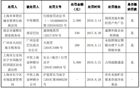 2019年5月21日,上海市公安局长宁分局临空经济园区派出所出具长公(临空)行罚决字[2019]100016号《行政处罚决定书》。中饮上海金钟路分公司因于2019年5月20日被查明有占用疏散通道的消防违法行为,被上海市公安局长宁分局临空经济园区派出所处以责令改正及罚款5000元的行政处罚。