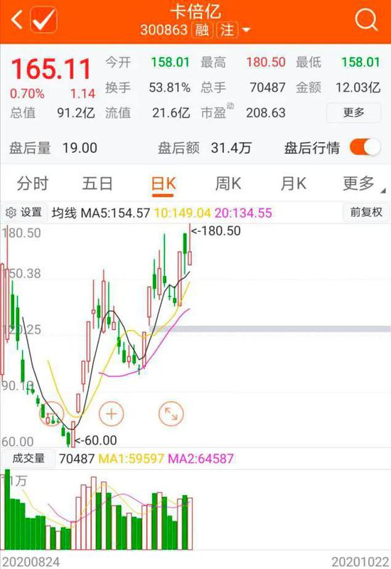 以卡倍亿为例,在此番连续大涨之前,该股也曾经历一波大幅下跌。自8月24日登陆创业板,在约半个月的时间里,卡倍亿的股价从最高179.50元,一度跌至60元,而这也为后续的反弹腾出了空间。