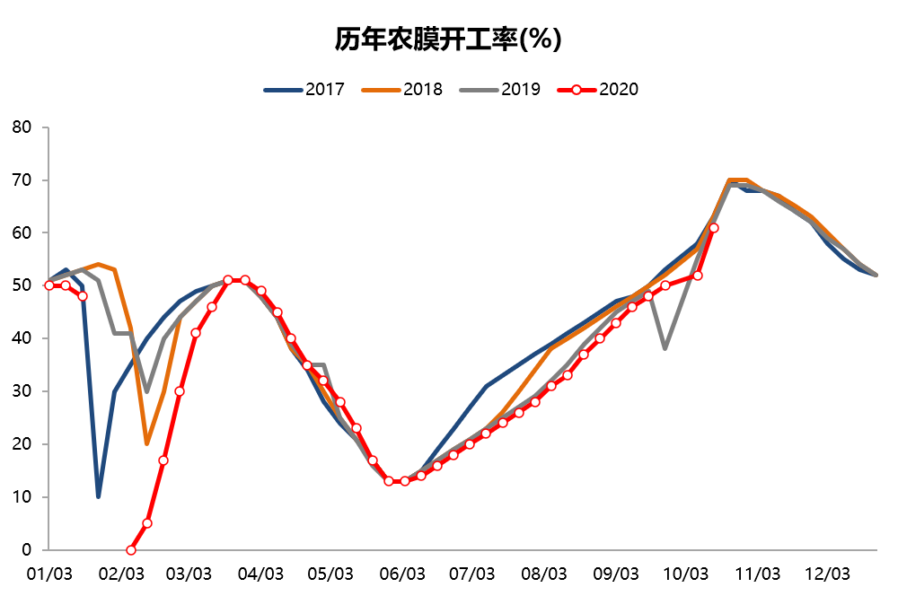 2.环保限产力度不及去年一半:去年山东9月23日就已经开启环保应急响应,出现重污染黄色预警,农膜企业要强制停工一半,橙色全部停工,今年放宽为黄色不限产,橙色停工一半,且今年尚未开始环保应急响应。2019年山东各市共发布重污染天气预警138次,其中黄色预警45次,橙色预警92次,红色预警1次,如果照搬这一数据计算,今年的限产次数不及去年的一半。根据我们为期一周的调研,实际空气质量要远远好于去年,可能最终对下游的限产力度仅为去年三分之一或更低。