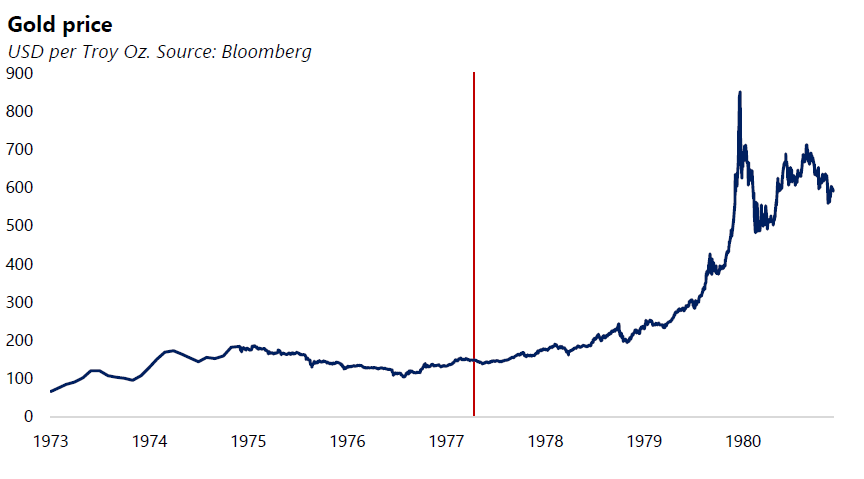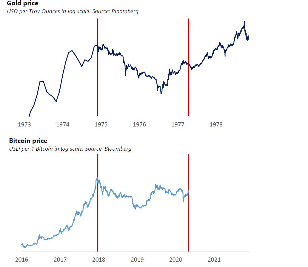 他还告诉客户,比特币让他想起了“黄金在上世纪70年代扮演的角色”。当时黄金作为一个新兴金融工具(就像今天的比特币),在一次牛市中涨了三倍,之后回调了50%。这和比特币在过去28个月回调80%类似。从下图中看到: