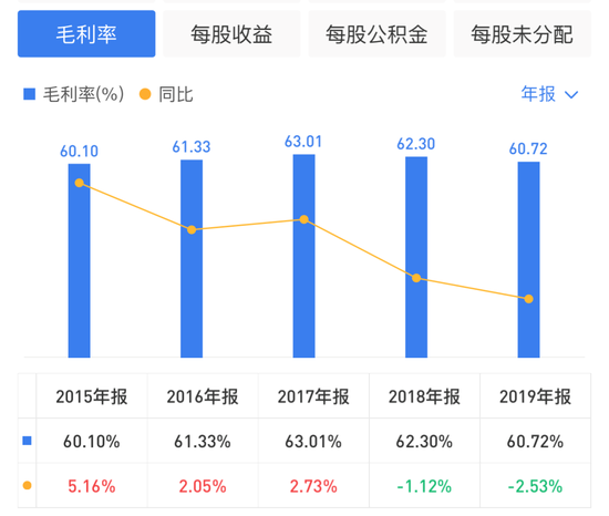 财报资料显示,2017年至2019年间,金徽酒毛利率逐年下滑,由63.01%下滑至60.72%。相较同为八大国酒之一的贵州茅台动辄90%以上的高毛利率相去远甚。