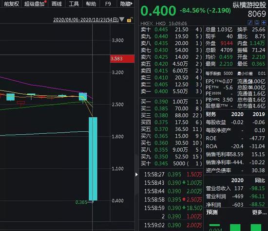 今天,港股纵横游控股(08069)开盘惨遭洗仓,开盘1分钟便狂泻超80%。开盘6分钟便暴跌85%。截至收盘,收跌84.56%,股价从2.2港元跌剩0.4港元,跌破所有均线,居跌幅榜首位。