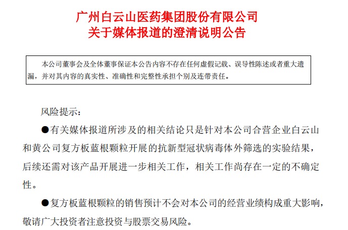 白云山18日发布澄清公告称,有关媒体报道所涉及的相关结论只是针对公司合营企业白云山和黄公司复方板蓝根颗粒开展的抗新型冠状病毒体外筛选的实验结果,后续还需对该产品开展进一步相关工作,相关工作尚存在一定的不确定性。复方板蓝根颗粒的销售预计不会对公司的经营业绩构成重大影响。