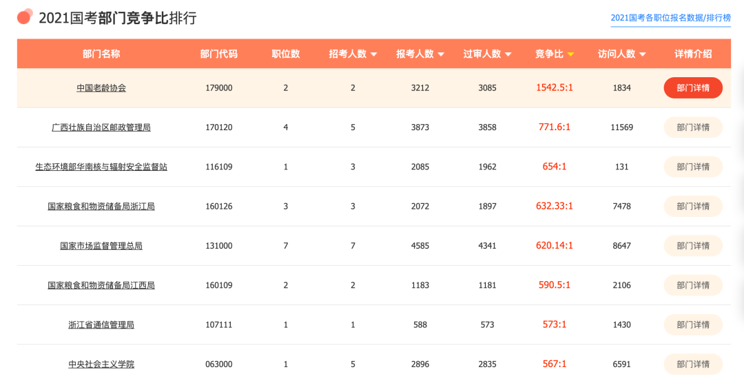有趣的是,今年,以年轻群体为主要考试人群的国考,部门竞争比第一的是“中国老龄协会”。该部门共吸引了3212人进行报考,该部门的竞争比高达1542.5:1。公开信息显示,该部门主要针对我国老龄工作中存在的问题,进行调查研究,提出建议等。