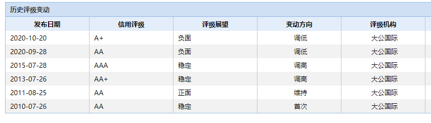 10月21日,大公国际资信评估有限公司将下调华晨集团的信用评级,将华晨集团主体信用等级调整为A+,评级展望维持负面,“17华汽01”、“18华汽债01/18华汽01”和“18华汽债02/18华汽02”信用等级调整为A+。