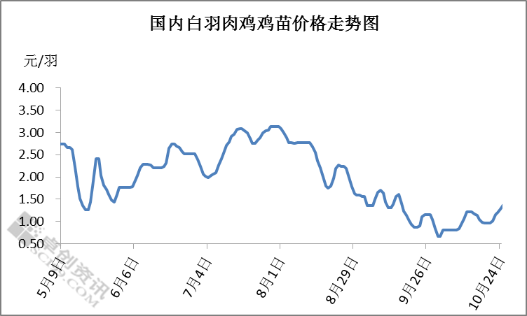 前期受白羽肉鸡价格走低影响,鸡苗市场跌至0.66元/羽,国庆过后鸡苗价格反弹至0.84元/羽。10月10日至24日白羽肉鸡价格持稳运行,但鸡苗市场截然不同,鸡苗市场呈现震荡走高走势。