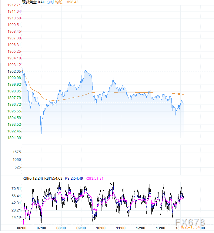 周一(10月26日)亚洲时段,黄金小幅下跌,且跌破1900美元/盎司关口,最低报1891.39美元/盎司。