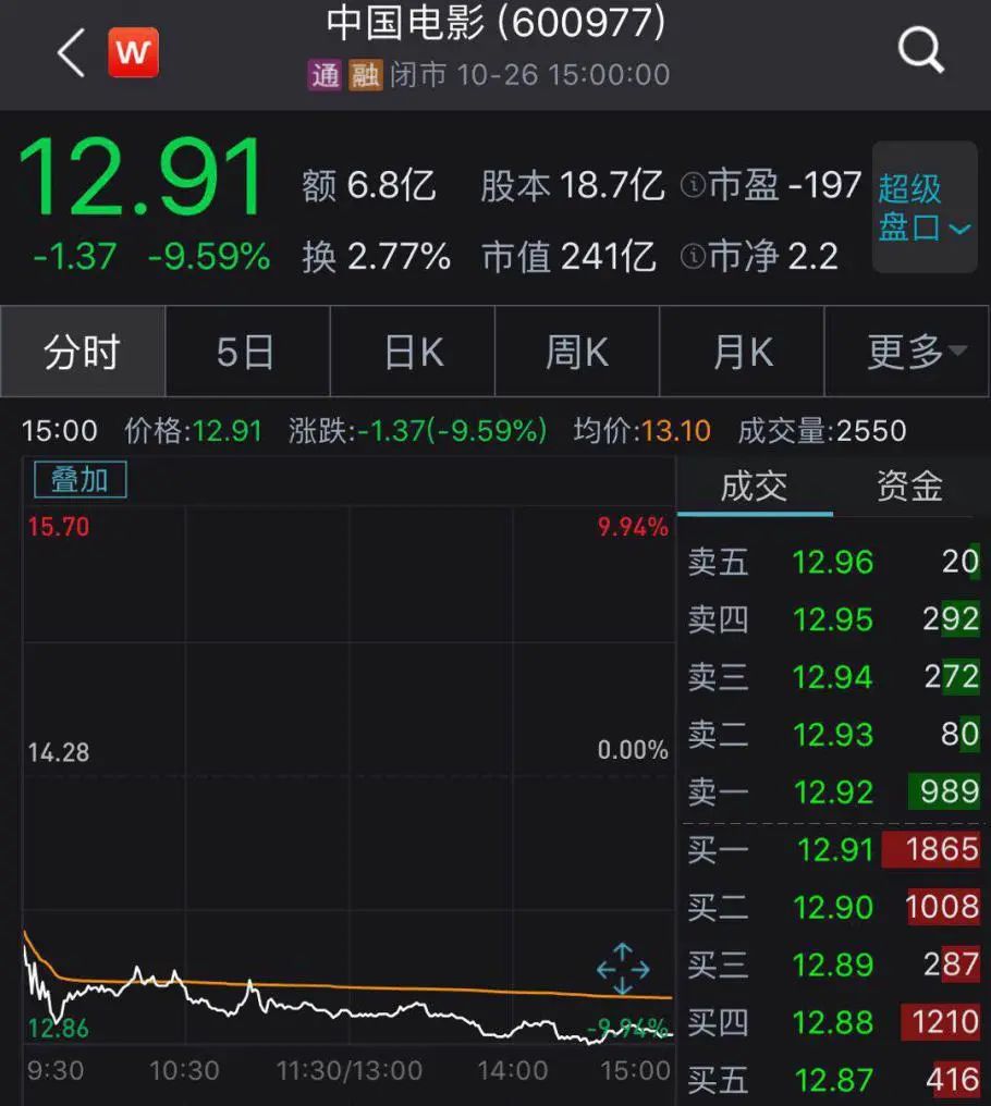 然而,这样不俗的成绩却并不令资本市场满意。今日早盘,金刚川主要出品方中国电影和华谊兄弟双双开盘大跌。截至今日收盘,华谊兄弟(300027.SZ)跌7.90%,中国电影(600977.SH)跌9.59%。