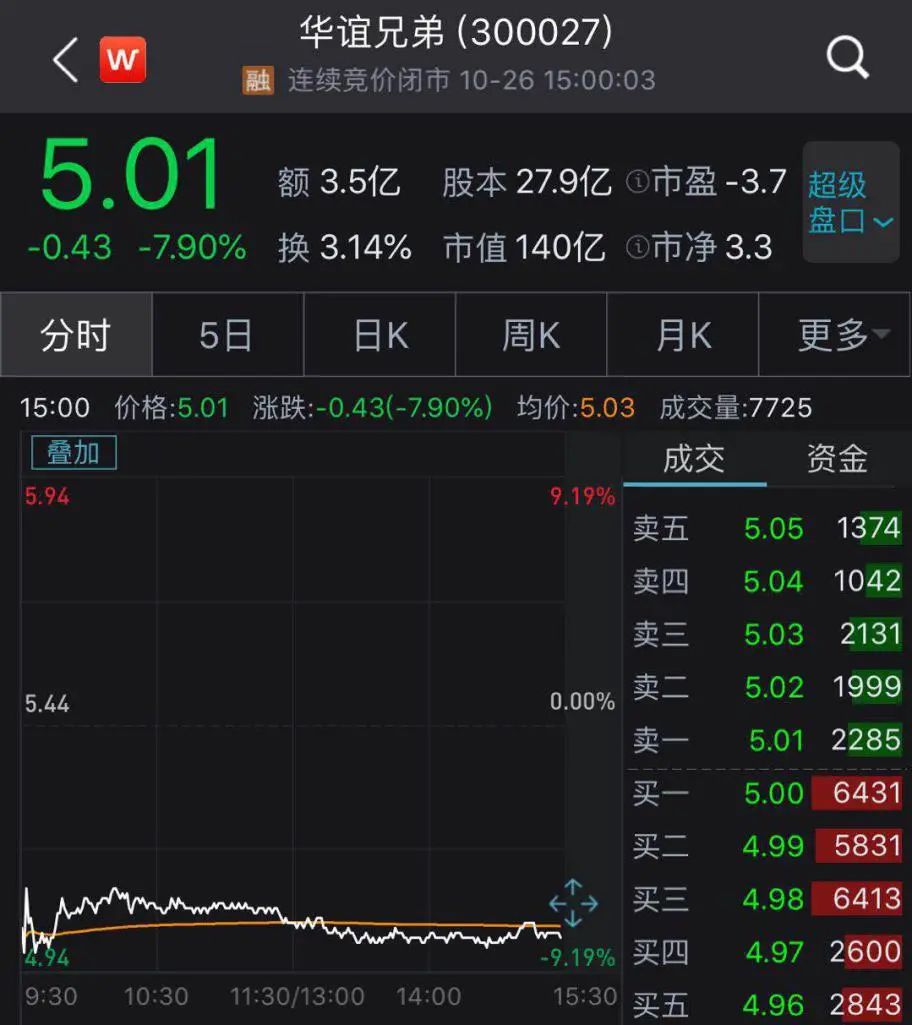 但随着《八佰》热度的消退,华谊兄弟股票也随之下滑,截至10月26日午间收盘,公司5.04元的股价,较8月24日7.20元的高点又下滑了25%左右。