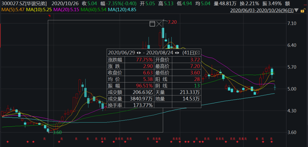 从6月底传出《八佰》定档的消息以来,华谊兄弟的股价走出了一条漂亮的上涨曲线。6月29日至8月24日,约两个月的时间,公司股价大涨77.75%,不仅走出3.60元的低谷,更是从7月到8月上演起了几乎翻倍的强势上涨行情。