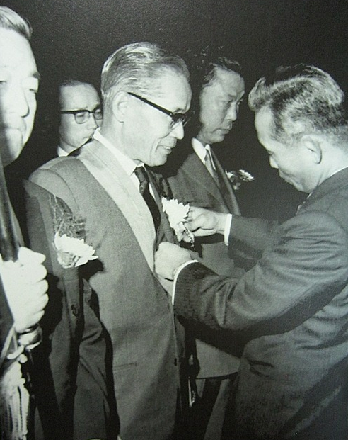 1969年12月1日,韩国前总统朴正熙为三星创始人李秉哲佩戴“金塔工业服务功绩勋章”。