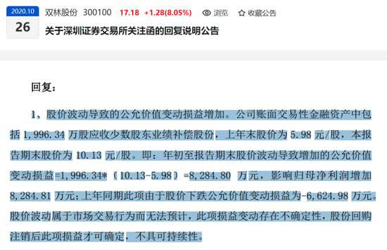 原来,双林股份账面交易性金融资产中包括1996.34万股应收少数股东业绩补偿股份,上年末公司股价为5.98元/股,本报告期末股价为10.13元/股。即:年初至报告期末股价波动导致增加的公允价值变动损益=1996.34*(10.13-5.98)=8284.8万元。这8284.8万元的账面收益,直接计入了当期利润。