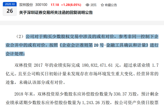 按照这种处理方式,2020年1-9月,双林股份确认应收双林投资原少数股东业绩补偿股份股价波动产生的公允价值与账面金额的差额,计入公允价值变动损益,计8284.8万元。