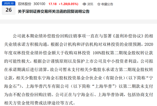 简单说,公司认为2020年双林投资还是完成不了业绩承诺,且缺口较大,想届时一次性清算。结果,宁海金石、上海华普以第二期现金转让款未支付为由不配合股份回购注销。没想到,双林股份“因祸得福”,坐享了一波股价上涨的“红利”。